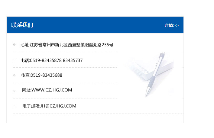 地址:常州市新北區友邦商務大廈1幢16、17層  電話:0519-85101652  傳真:0519-85112595  郵編:213022  網址:www_cz-jiayue_cn.hs1886.com  郵箱:xiajifengaa@163.com